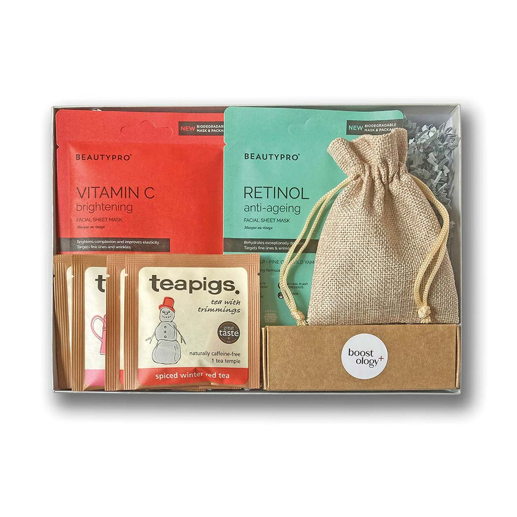 • Contains pampering face sheet masks, natural essential oil candles, fairtrade dark chocolate mini-bars & luxury Christmas tea temples