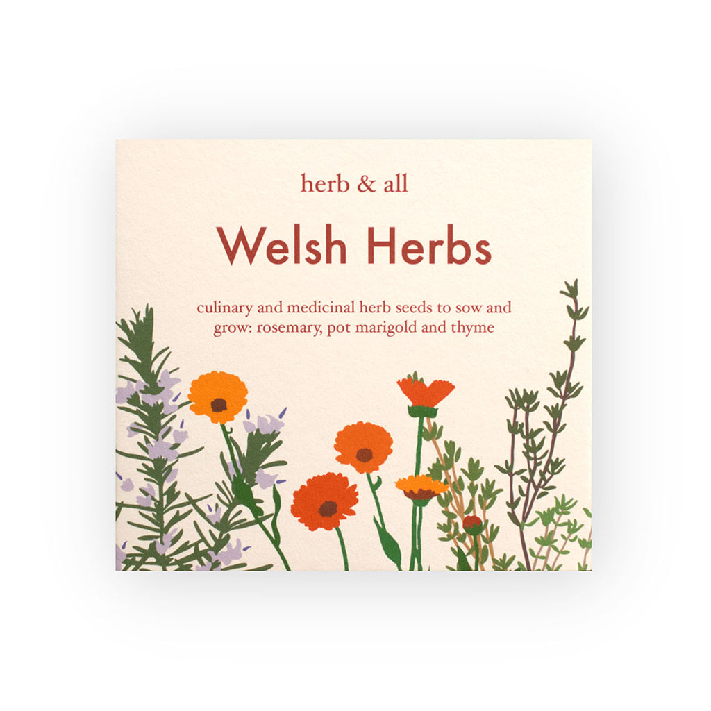 A white box with the words "Welsh Herbs" and illustrations of herbs underneath